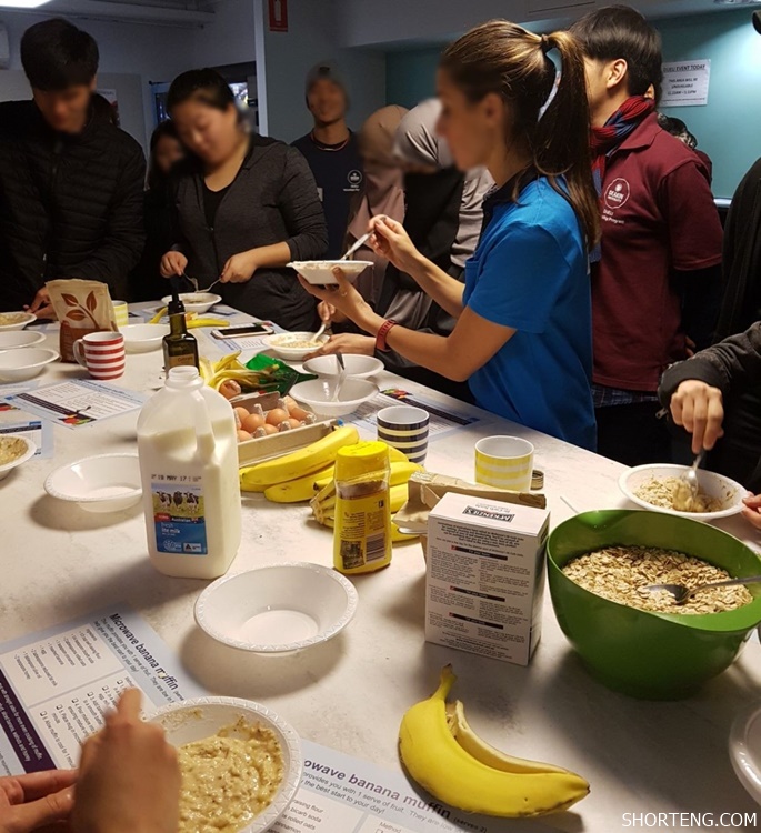 กิจกรรมที่เราได้ไปร่วมในขณะเรียนภาษาที่ออสเตรเลียอีกกิจกรรมก็คือ กิจกรรมที่เรียกว่า Cooking Class โดยกิจกรรมนี้จะจัดขึ้นในวันอังคารWeek ที่ 2 ของเทอม และตอนที่เราไปร่วมเป็นการทำขนม Banana Muffin ด้วย ซึ่งกิจกรรมนี้เค้ารับเพียงแค่ 30 คนเท่านั้น และแบ่งออกเป็น 2 ช่วงเวลาๆละ 15 คน สำหรับการทำกิจกรรมนั้นทางเจ้าหน้าที่จะเตรียมอุปกรณ์และวัตถุดิบให้เราทุกอย่าง ตั้งแต่สูตรการทำขนม ส่วนผสม เครื่องไม้เครื่องมือในการทำ ไปจนถึงเจ้าหน้าที่ดำเนินการสอนทำขนม Banana Muffin